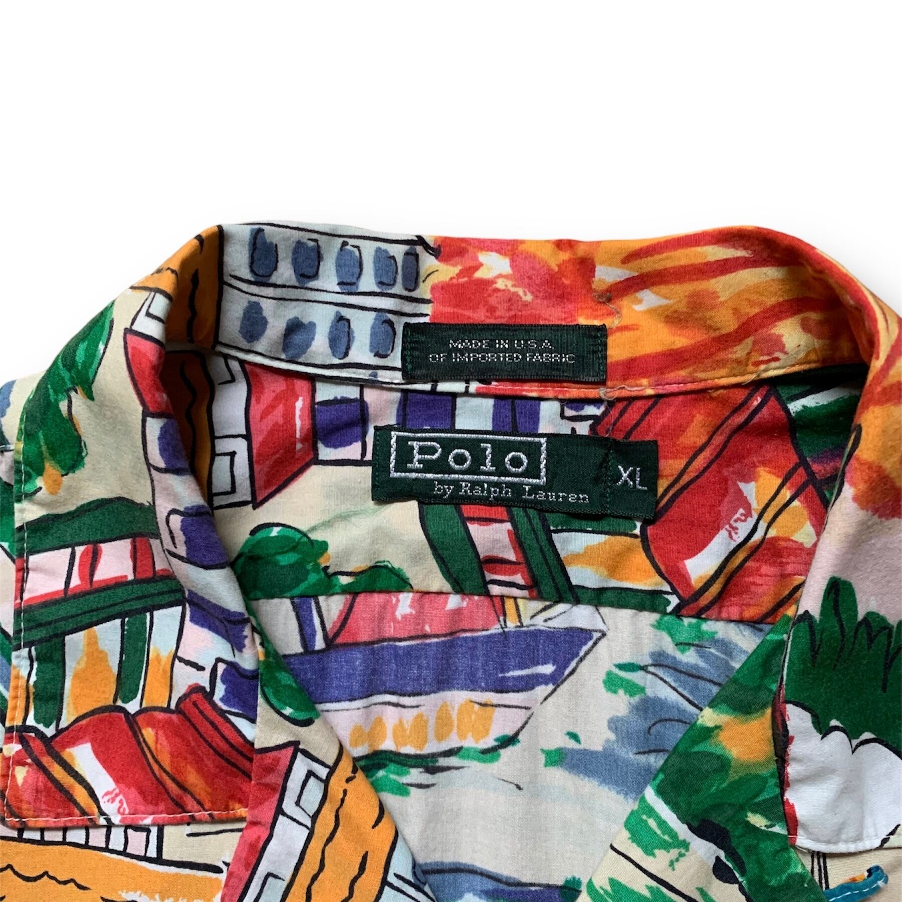 80年代頃の緑タグがつく今では希少なUSA製のラルフローレン。ハワイアンの様なスケッチ風のオールオーバーパターンが目を惹きます。