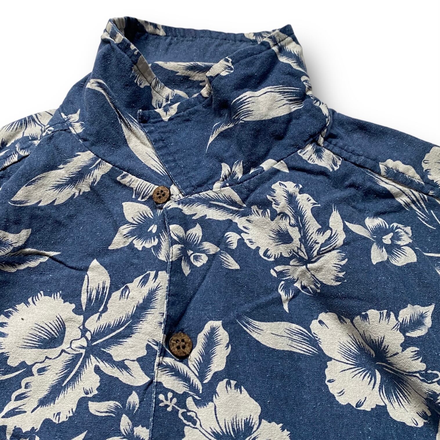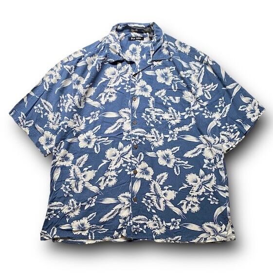 青ベースに白のハイビスカス柄と落ち着いた色使いでシックな印象もありながらハイビスカスのハワイアンシャツらしさも感じられる1着です。