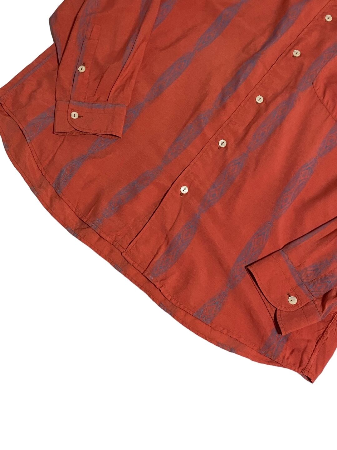 淡い赤とオレンジの間のような絶妙なカラーリング、縦に入るストライプの柄、イタリア製らしい色気のある気の利いた洒落た1着です。