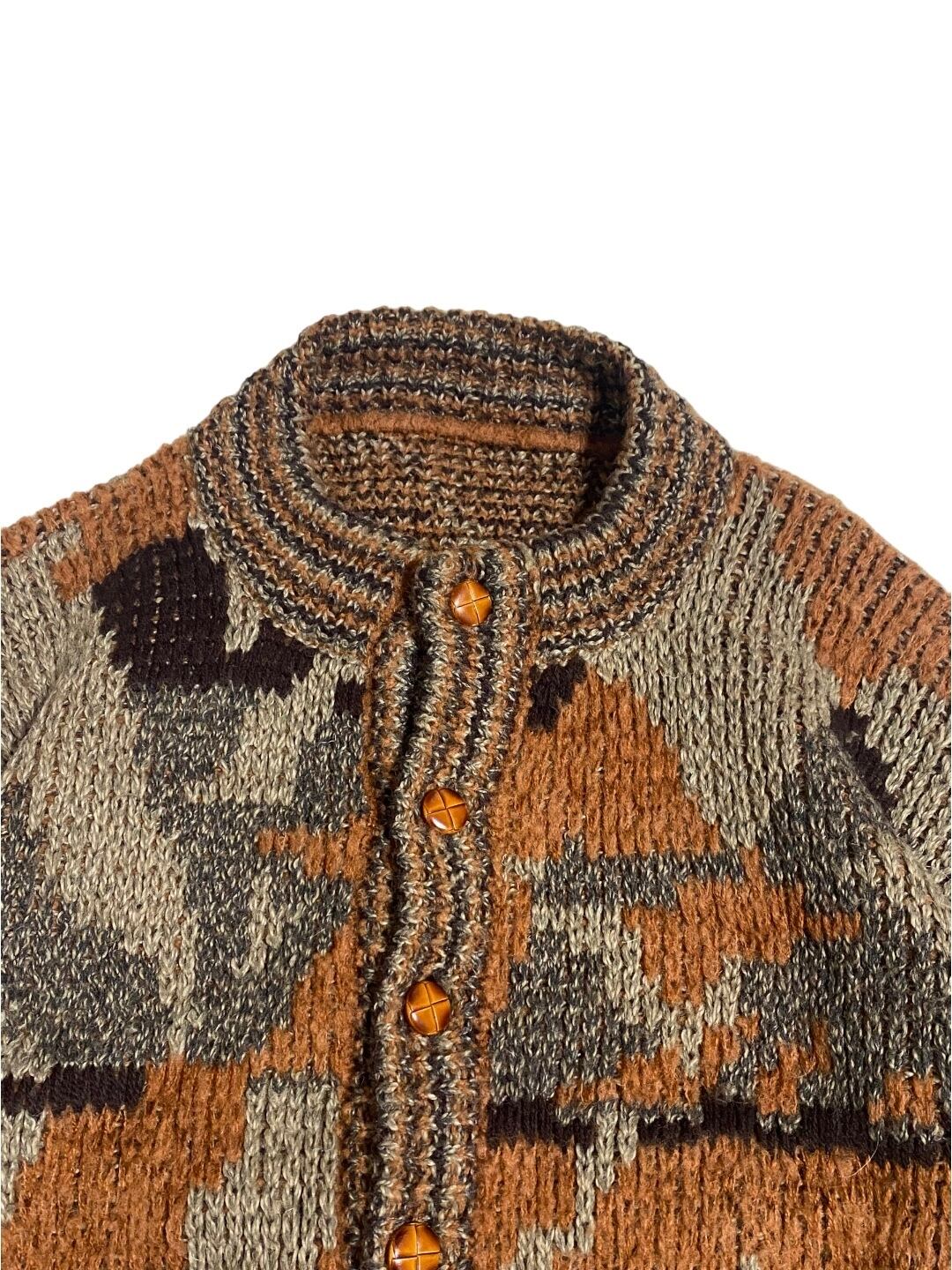 暖かみのあるオレンジ、ブラウン、ベージュの色味やウッドボタン、ノーカラーの襟やざっくりと編まれたローゲージ編み。