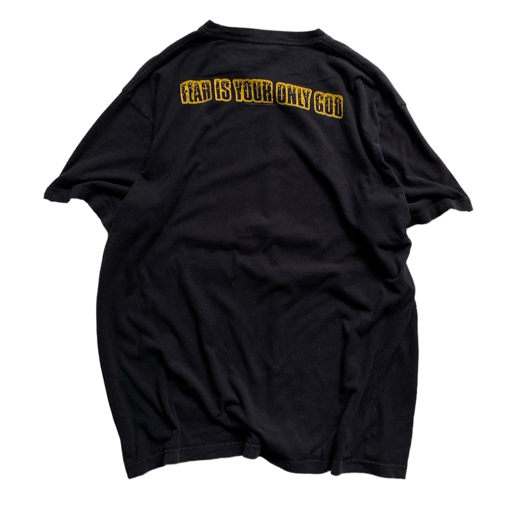 バックにはアルバム内の曲"vietnow"の歌詞 「fear is your only god 」のプリント。